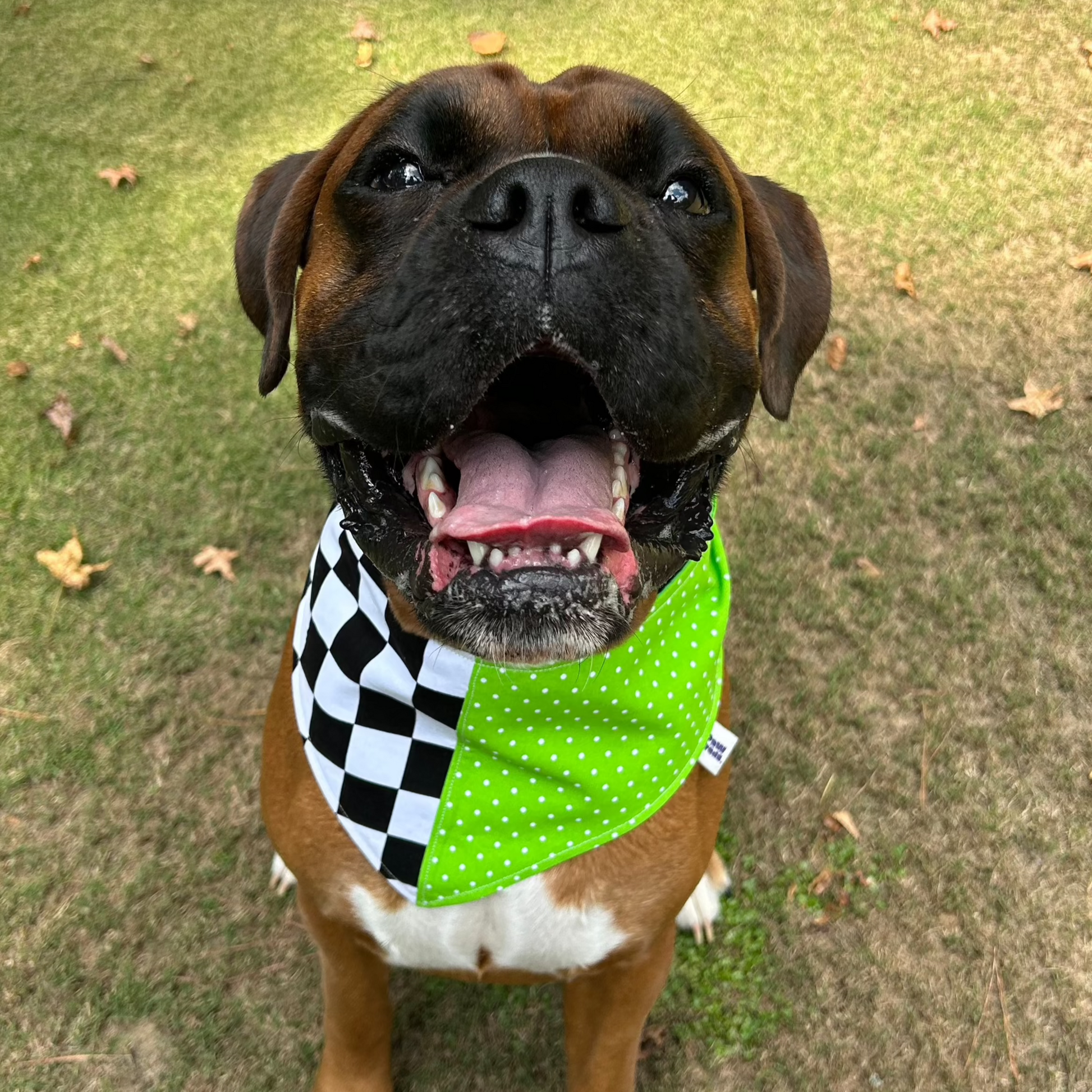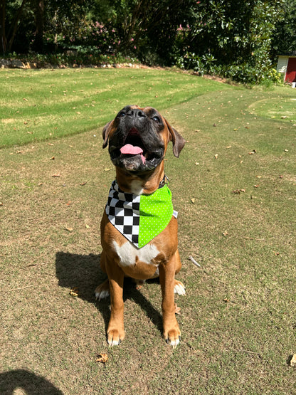 Our Check Me Out snap bandana pairs playful green checkers with classic polka dots for a look that turns heads. Double-sided for twice the style—perfect for pups who love a little extra attention (and treats)